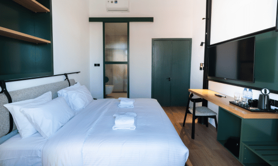 • Az „Annex Block” megjelölésű szobák – stúdiók és két hálószobás lakosztályok – a Kentrikon Boutique Hotel épületétől körülbelül 100 méterre, rövid sétára találhatók. Ezek a szobák szintén frissen felújítottak, egy különálló, szép épületben helyezkednek el.